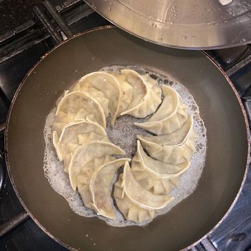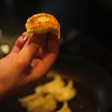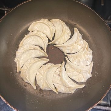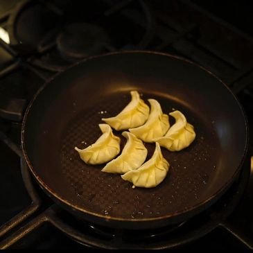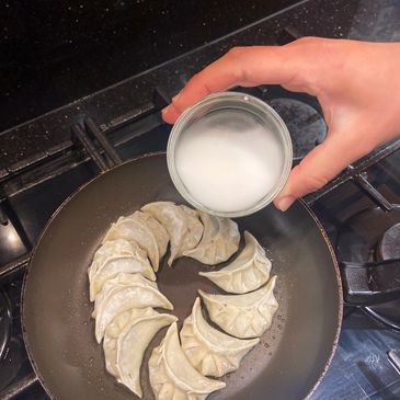 One by one, slide your frozen gyozas into the hot oil.