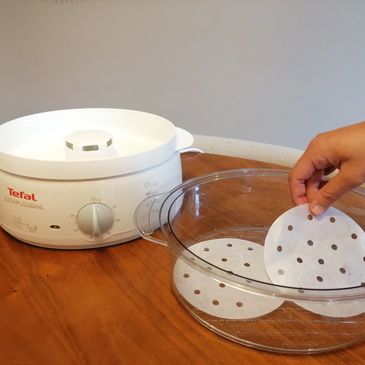 Arrange your gyozas in the lined basket leaving gaps between each to ensure the steam hits every surface.