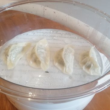 Pour water into your steamer, place your gyozas on top and cover with the lid.