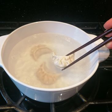 Swirl the water around to ensure the gyozas cook evenly and don't get stuck to the pot.