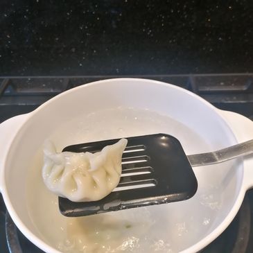 Using a slotted spoon, remove the gyozas from the water and serve.